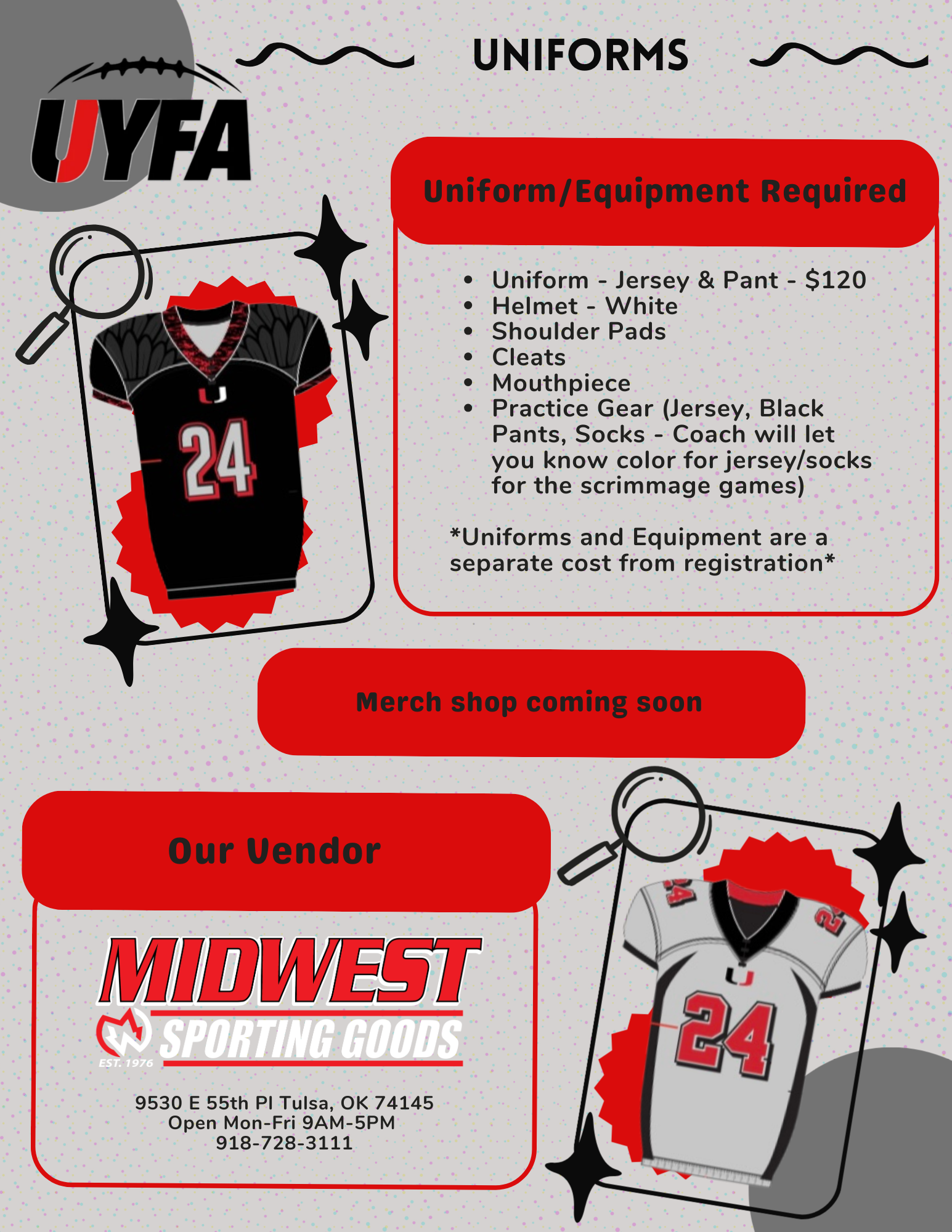Our uniforms are provided by Midwest Sporting Goods. All uniform orders need to be placed by 7/15 to be here on time for the first games. We will have our annual uniform fitting event on 4/25 from 9am-2pm.